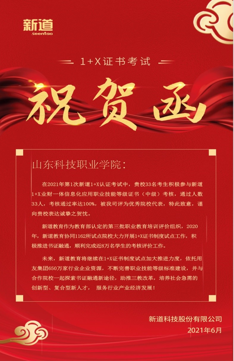 2021年5月29日业财一体信息化应用职业技能(中级)认证考试在bw必威西汉姆联考点顺利举行,必威西汉姆官网平台会计专业的33名同学参加考试,并取得了100%通过的好成绩,证书评价方新道科技股份有限公司专门向学院发来贺函以示祝贺。