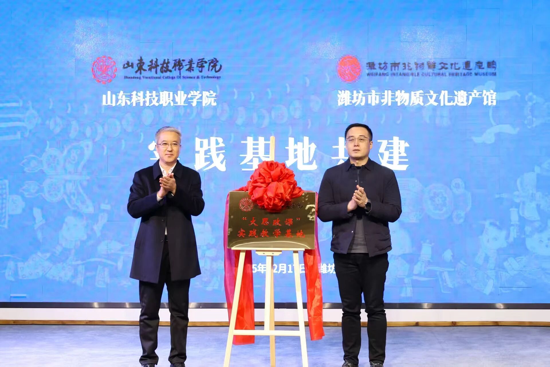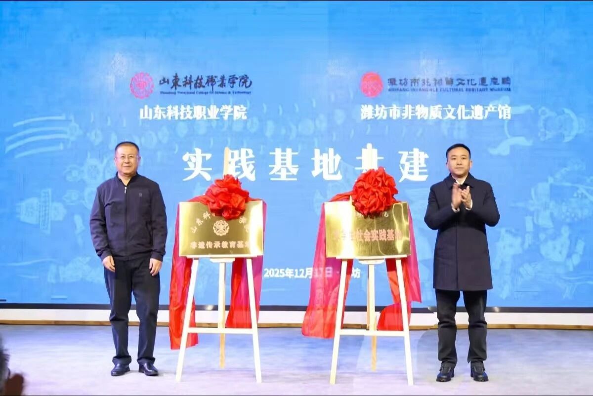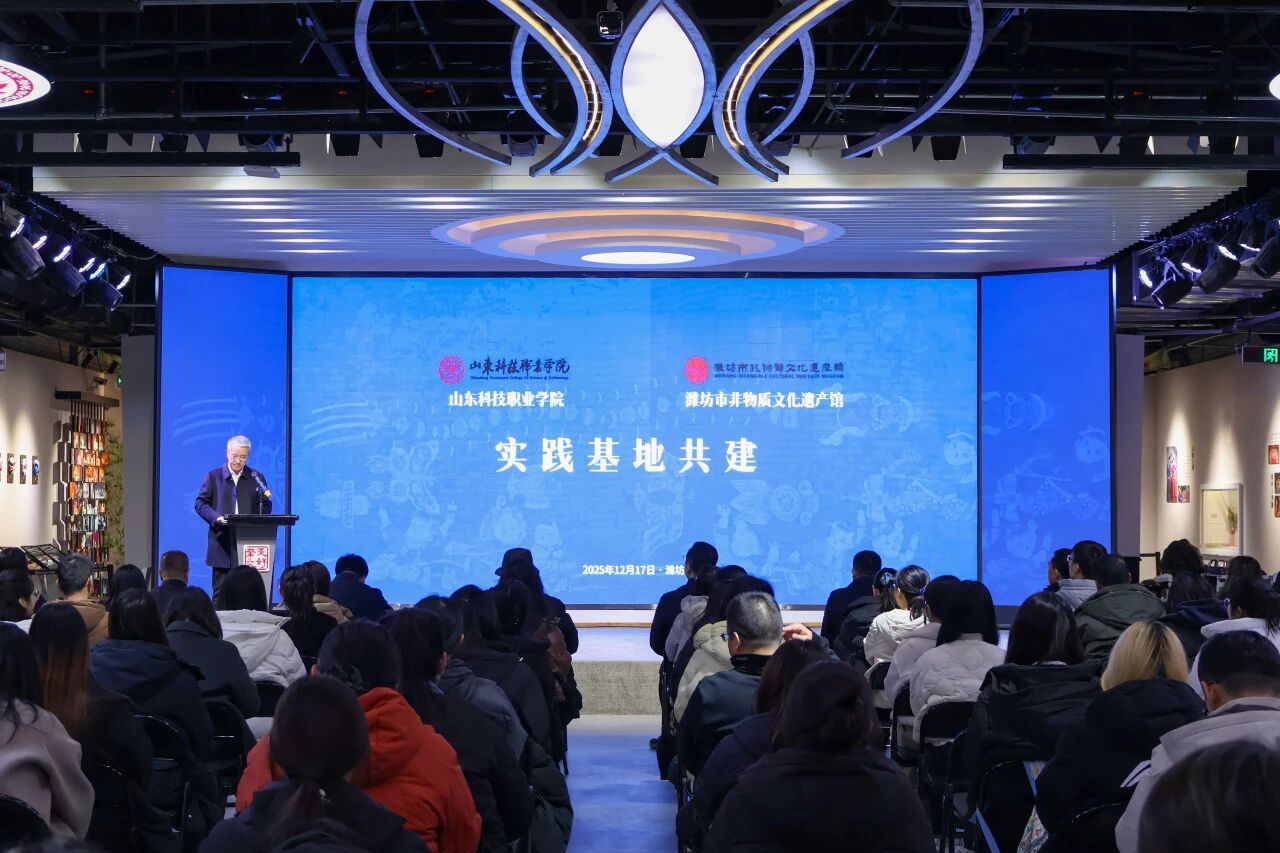 12月17日,bw必威西汉姆联与潍坊市非物质文化遗产馆共建“大学生社会实践基地”和“非遗传承教育基地”,揭牌仪式在潍坊市非物质文化遗产馆举行。学校党委副书记秦建坤,潍坊市文化和旅游局党组成员、四级调研员李义龙,齐鲁文化(潍坊)生态保护区服务中心副主任、潍坊市非物质文化遗产馆馆长徐明政,潍坊市非物质文化遗产馆代表,必威西汉姆官网平台党总支、思政课教学部、审计处直属党支部、图书馆直属党支部全体党员及学生入党积极分子代表70余人参加了本次活动。