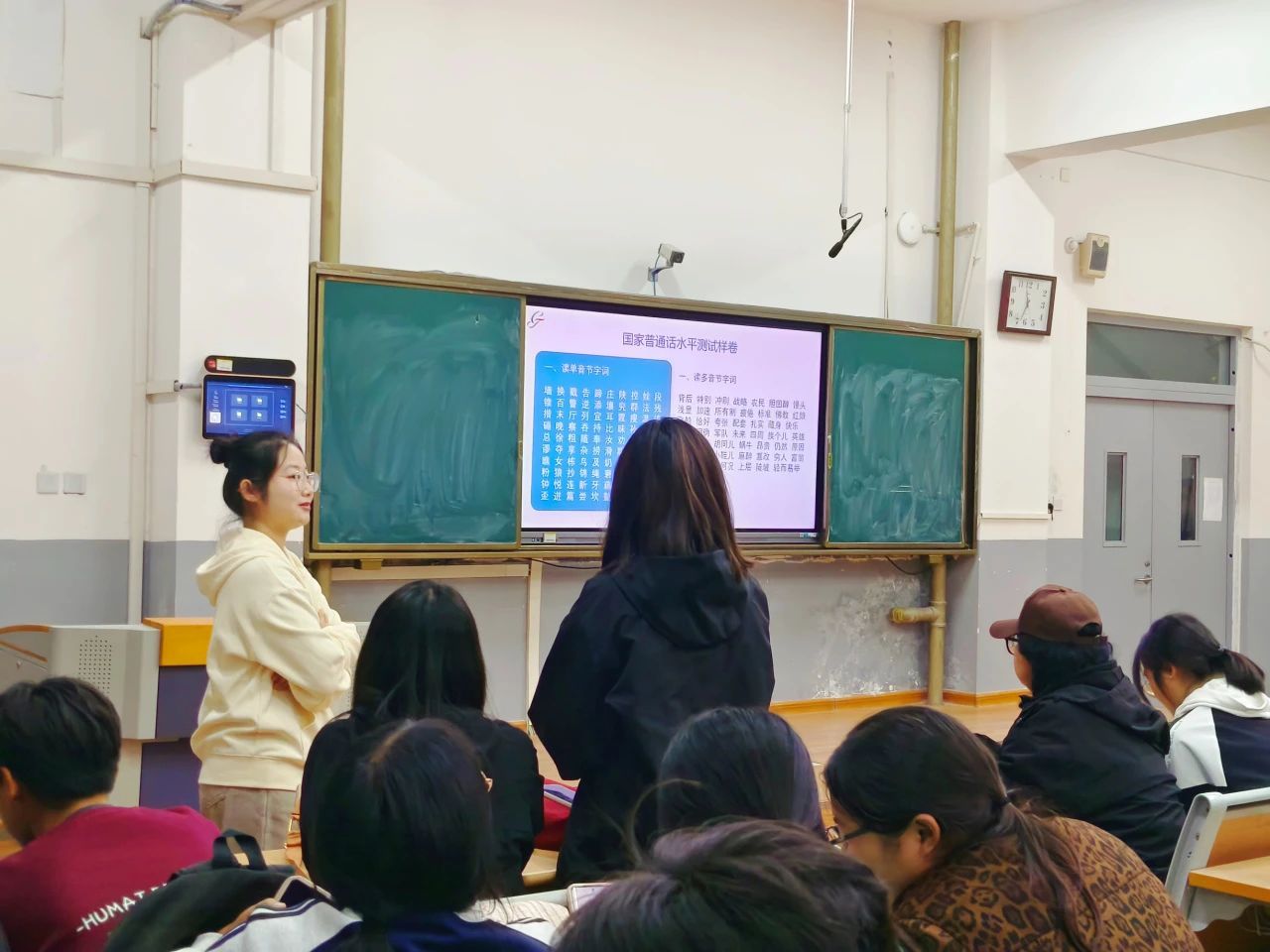 培训过程中,辅导员详细介绍了考试流程、内容、评分标准及注意事项,结合往届真题对学生进行音节字词、短文朗读、命题说话等方面的专项训练,通过跟读、纠错等互动环节帮助学生提升应试技巧。培训现场气氛热烈,学生在字词发音、逻辑表达、文化素养等方面均取得了一定进步,提升了应试信心。