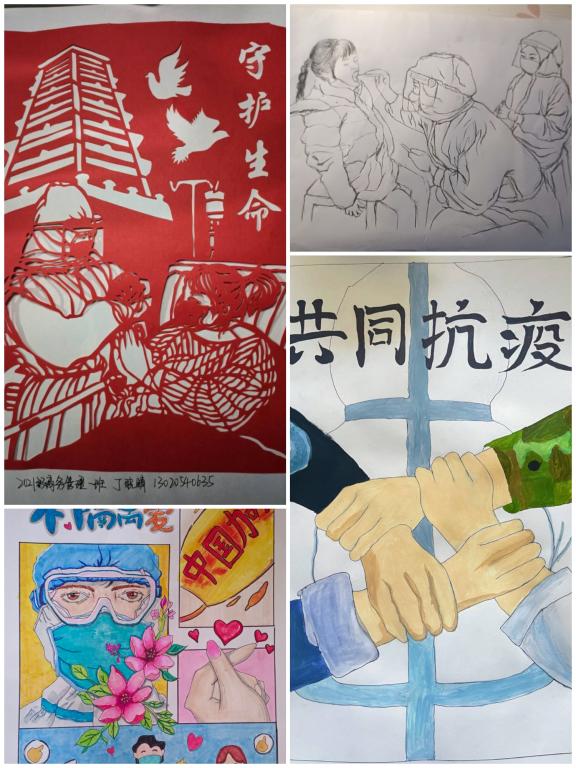 在本次活动同学们积极参加,作品形式多样、创意新颖,一笔一划尽显真情,对奋战于一线抗疫人员的感谢之情跃然纸上。同学们将奋战于一线的医护人员以天使作比,绘以祝福众生,守护百姓之姿,歌颂抗疫人员对人民的赤诚和对生命的敬佑;更有泼墨挥毫,镌以中流砥柱,逆流而上之态,以一句“临危受命敢当先,虎穴龙潭冲向前”赞扬抗疫人员的无畏精神。每一幅作品都将一线防疫工作者寻常的背影、坚强的力量淋漓尽致的绘于纸上;每一幅作品都展现着同学们对一线防疫工作者辛勤付出的崇高敬意和衷心感谢。