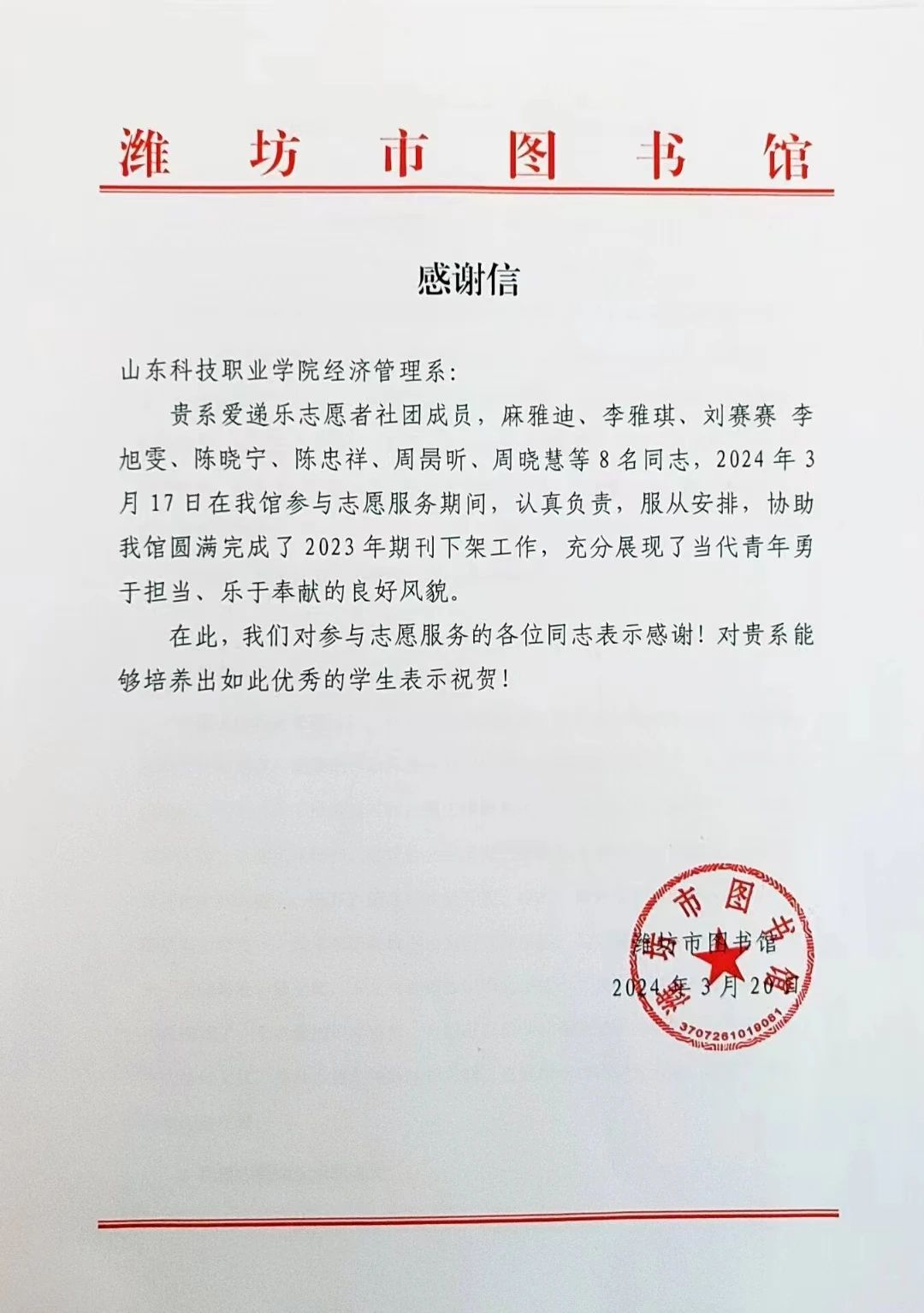 近日,必威西汉姆官网平台收到潍坊市图书馆发来的感谢信。信中表示,我系爱递乐志愿者社团成员,麻雅迪、李雅琪、刘赛赛、李旭雯、陈晓宁、陈忠祥、周昺昕、周晓慧等8名同志,2024年3月17日在潍坊市图书馆参与志愿服务期间,认真负责,服从安排,协助图书馆圆满完成了2023年期刊下架工作,充分展现了当代青年勇于担当、乐于奉献的良好风貌,受到了潍坊市图书馆领导、工作人员和读者的一致好评,为社会公益作出了积极贡献。