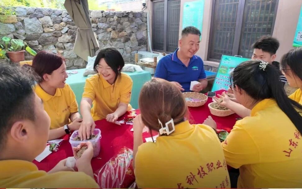 回到有艾工坊,同学们开始了艾草深加工体验。在工作人员指导下,大家先将晒干的艾叶放入研磨器,学习传统艾绒研磨技艺。随着艾叶渐渐变成细腻的艾绒,逐渐散发出独特的草药香气。随后,同学们动手制作艾草香包。从填充艾绒到缝合装饰,同学们见证了艾草从田间到文创产品的华丽蜕变,深刻感受到传统工艺与现代产业的融合之道。