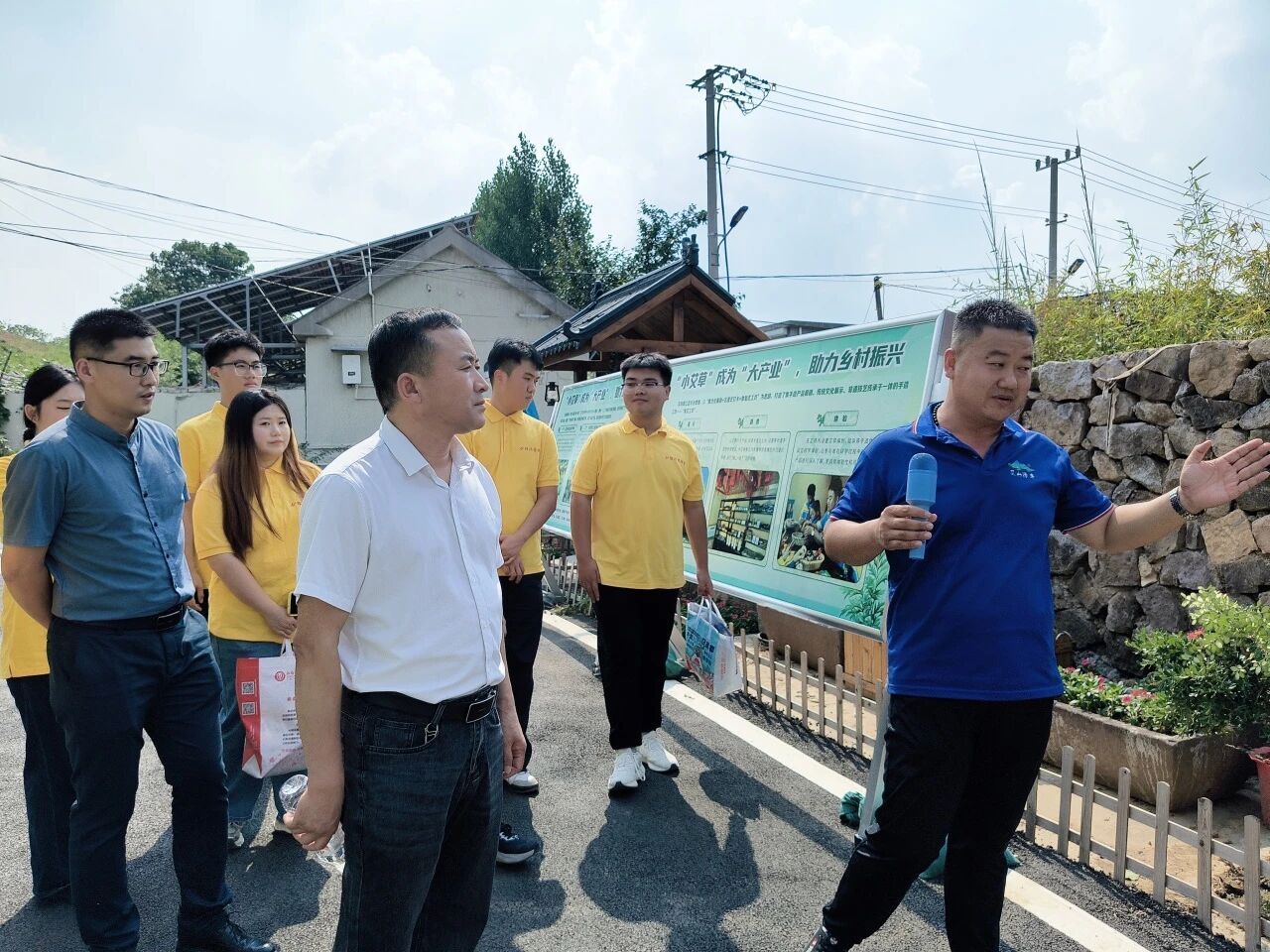 在兴郭村,艾山泽丰农业合作社负责人卜钦龙热情接待了志愿服务队师生,并为大家详细介绍了村子的历史由来和发展变迁。他讲述了兴郭村如何从传统农耕村落转型为以艾草产业为核心的特色乡村,以及艾草在现代健康产业中的价值和地位。他指出,艾草因其独特的药用和保健功效,在中医理疗、养生保健等领域需求旺盛,已成为带动村民增收的“致富草”。从最初的村民怀疑到如今的广泛认可,艾草产业不仅促进了当地经济发展,更成为乡村振兴的重要引擎。