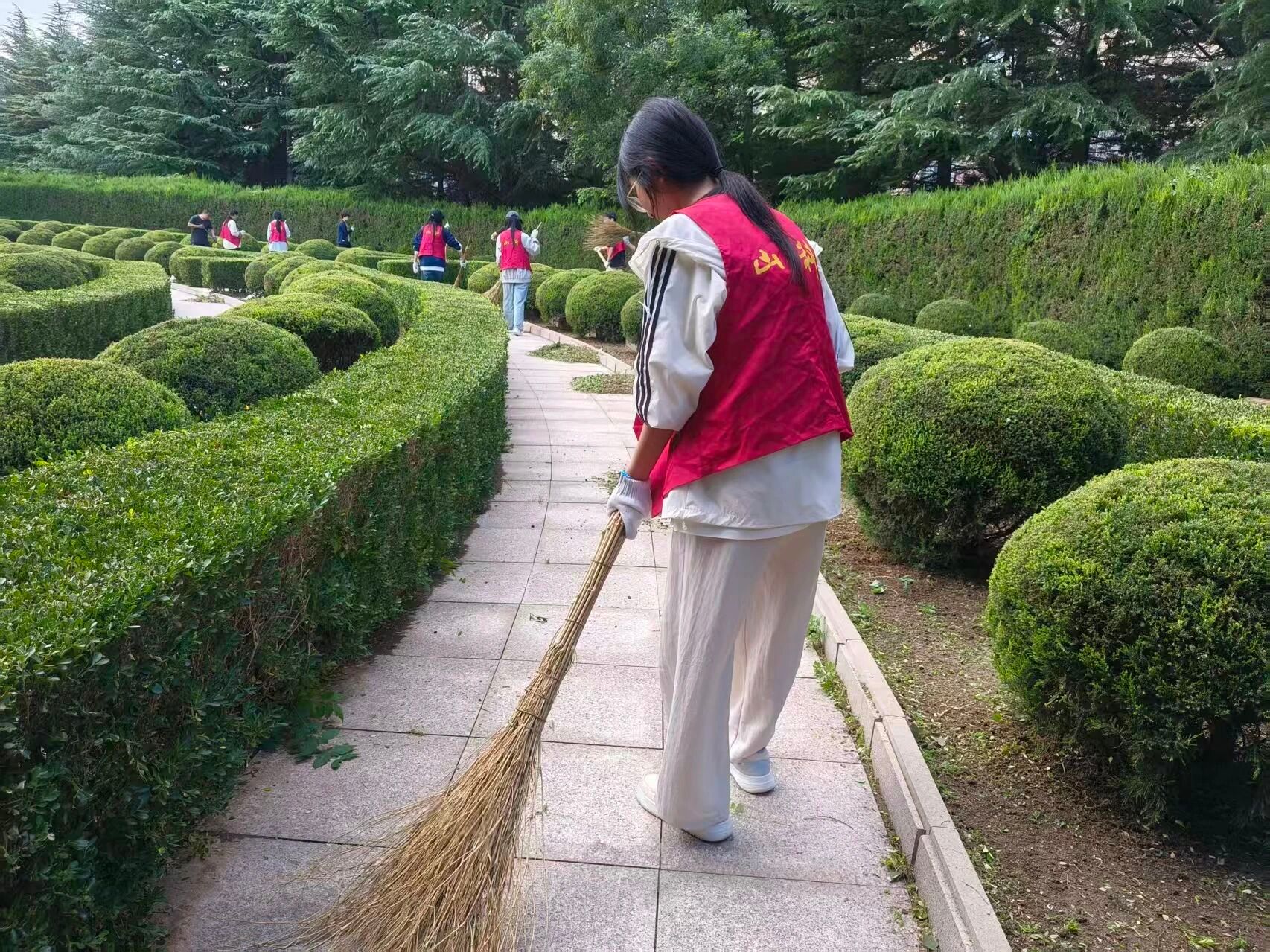 参观结束后,志愿者们怀着敬仰之情,迅速投入到烈士陵园的环境维护工作中。一组志愿者手持清洁工具,细致地擦拭烈士墓碑,清扫陵园内的枯枝落叶。另一组沿着陵园步道、草坪清理落叶、碎石与生活垃圾,细致排查卫生死角。每一次擦拭,都饱含着对先烈无限的追思;每一处打扫,都彰显着对英雄至高的敬仰。志愿者们以无声的劳动与赤诚的汗水,守护这片圣洁的“精神家园”,让红色遗迹焕发更加庄重光辉。