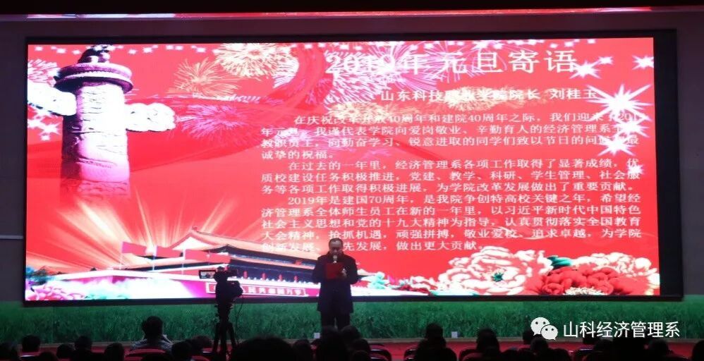 晚会伊始,陈守学书记转达了刘桂玉院长和丁文利副院长的新年贺词,并代表必威西汉姆官网平台师生向应邀出席的嘉宾表示欢迎,对同学们表达新年祝福和希望!随后,晚会现场播放了必威西汉姆官网平台教师代表及学生代表的新年祝福视频剪辑。