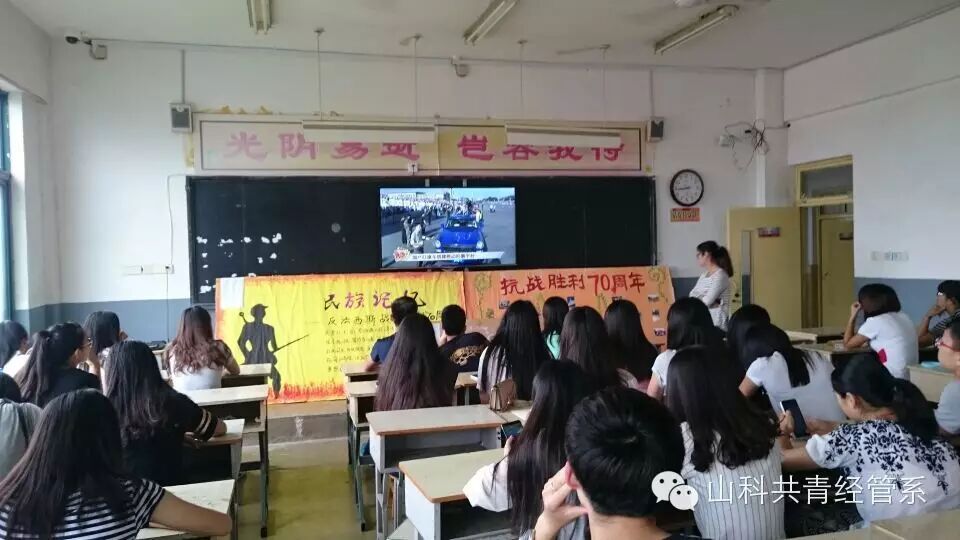 为了纪念中国抗日战争70周年纪念日,学院响应组织号召,我系积极组织配合,增强学生的集体荣誉感和爱国意识。9.3日上午我系学生科组织同学们分别在宿舍和教室观看了抗战胜利70周年阅兵的全过程,徐艳老师也全程参与了阅兵仪式的观看。过程中,我们全体起立奏唱跟随阅兵仪式的国歌,让我们感受到了高度的历史使命感和责任感。
