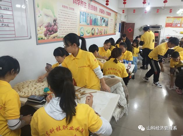 志愿者同学每四人一桌,分工有序、配合默契,有端饺子馅的,有拿筷子的,有压皮的,还有送饺子皮的