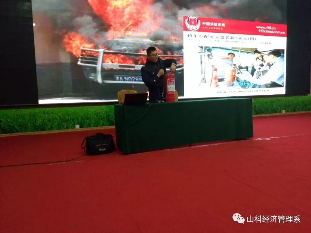 讲座中,王建朋教员向同学们讲述了消防基础知识、学校防火知识以及防火预防、火灾现场自救逃生等基础常识,并列举了大量事例。随后,王建朋教员向大家详细介绍了几种常见灭火器的使用方法,并依步骤演练,为大家普及了火灾发生初期自救、抢险的科学方法,提醒每名大学生要主动学习消防安全知识,掌握基本的火灾逃生技能。