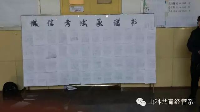 正值本校学风建设年,考风考纪作为着力点更是重中之重,而诚信是个人立足之本,它在即将到来的期末考试中显得尤为重要。 “诚信就是一面旗帜”,大学生是最具有影响力的优秀群体,每位班级干部都应力所能及地对身边的同学进行“诚信考试”的教育和引导,及时劝诫或制止考试作弊行为的发生,以实际行动为诚信校园的建设做出一份贡献。由三热部干事臧爽爽领誓:我在以后的考试中,本着以"自力更生为荣,依靠作弊为耻"的态度,杜绝一切不诚信手段,揭露一切不诚信行为,还考场清明,还知识圣洁。对每一场考试必付全力,对每一场考试诚信以待,考出水平,考出作风。会议就在同学们铿锵有力的誓词中结束了。每个考勤班长都庄重地在诚信考试承诺书下写下自己的名字,作出诚信考试拒绝作弊的决心。最后,14、15级各考勤班长带领所有同学进行签名宣誓活动。通过此次宣誓仪式,相信同学们都充分认识了诚信考试的重要性,并能够引领思想,用自身行动营造良好的“诚信考试”氛围,为我院学生树立榜样。