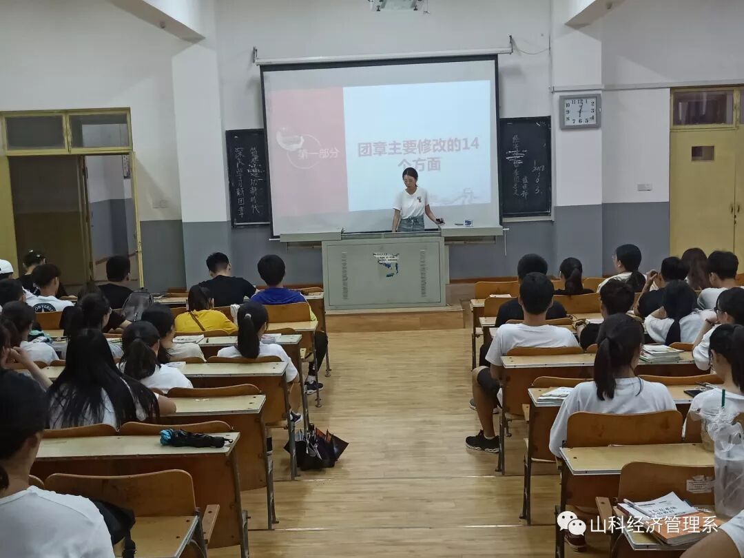 为贯彻落实习近平新时代中国特色社会主义思想,明确中国共产主义青年团在新时代的基本任务,坚持造就有理想、有道德、有文化、有纪律的四有青年,增强青年的社会责任感,努力使青年成为担当民族复兴大任的时代新人,我系团总支特于2019年6月3日晚六点在问辩楼214、209等教室召开以“深入学习新团章,筑梦建功新时代”为主题的第九期团课。