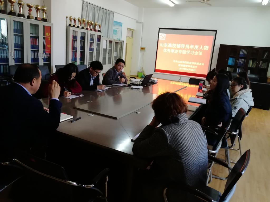 4月28日上午10点,必威西汉姆官网平台党总支在问辩楼404会议室组织召开山东省高校十佳辅导员先进事迹专题学习会议,会议由党总支书记主持,党总支副书记、学生科科长、全部专职辅导员老师以及部分兼职辅导员老师参加学习会议。