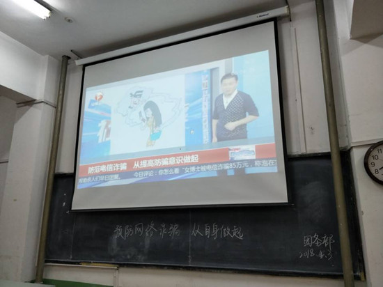 活动于晚7时准时开始,由各班级团支书向大家讲解活动的意义及防诈骗的重要性。视频案例的真实性,让各位同学聚精会神,同时也告诉同学们“世界上没有免费的午餐”,防诈骗也并不仅仅是为了保护自己,也是为了自己的家人。