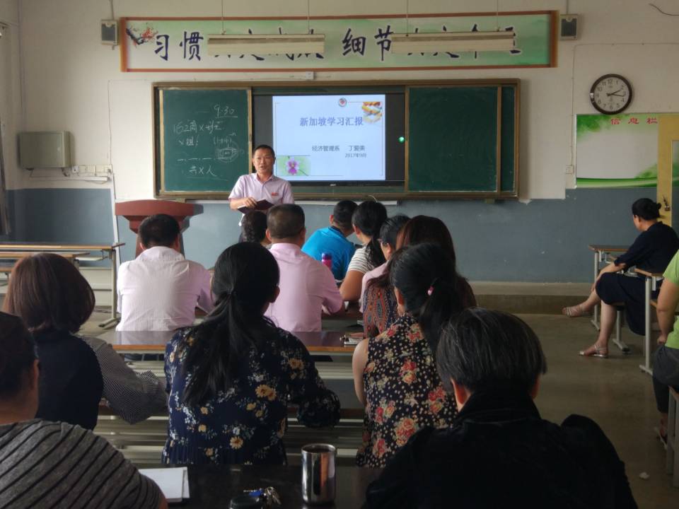 交流活动首先由物流管理专业主任丁爱美老师的“新加坡学习汇报”开始。丁老师从新加坡简介、新加坡教育体系、新加坡职业教育体系三个方面展开交流汇报,她将新加坡的历史文化、教育体系和职业教育体系的历史形成背景与现代发展趋势清晰地呈现给与会老师,让全体老师从宏观上全面地了解了新加坡职业教育体系的文化与内涵。随后,工商企业管理专业主任王海明老师结合自己的考察感受从微观层面给大家带来了“软硬兼施”的汇报内容。王老师从人才培养模式和教学实施两个主题,就设计理念、培养目标、教学模式、实施载体、课程安排和自我评估、组员评估、学习心得、作业九个操作层面进行了详细阐述。