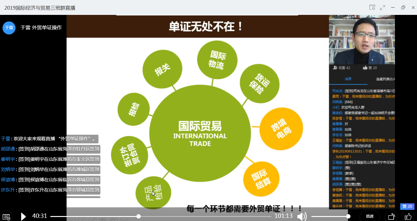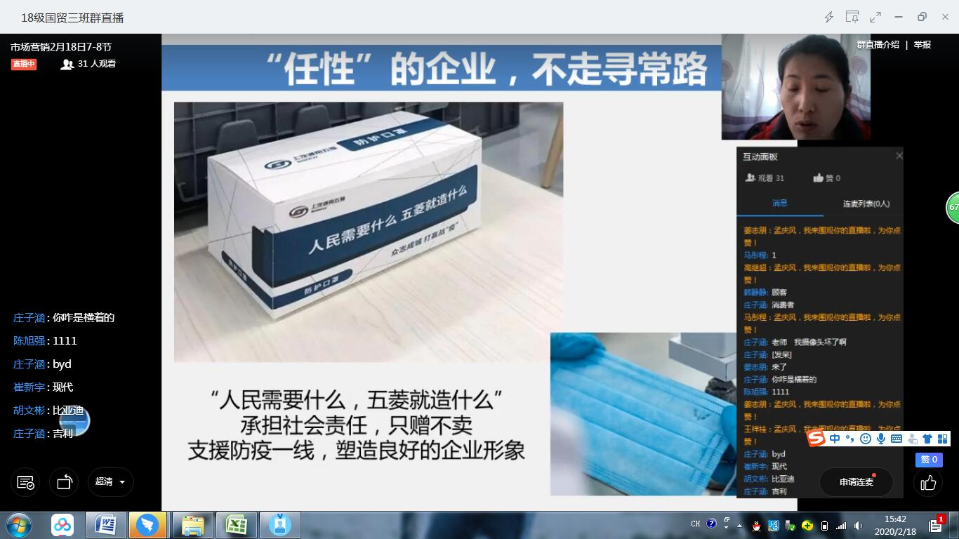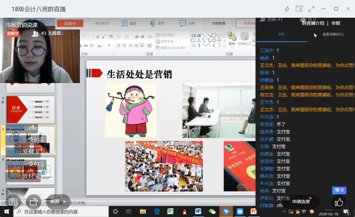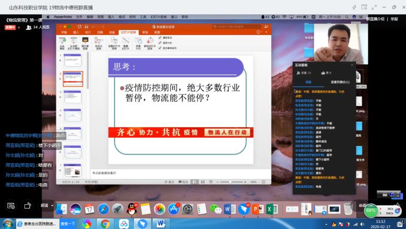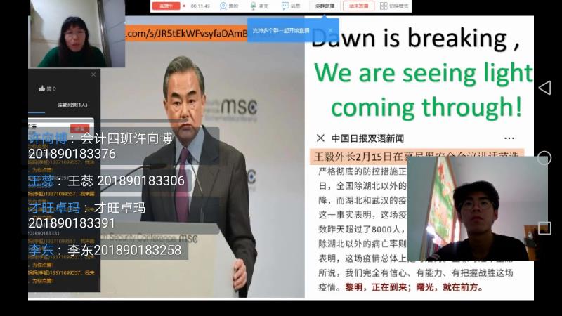 依托前期精心筹备的课程资源和超星、钉钉、腾讯视频等直播软件,必威西汉姆官网平台加强对教师网络授课的观测与帮扶,在全系范围内广泛开展了“全员听课”活动。老师们加入到各班级授课群,通过“预约听课”、“随机听课”、“课程点评”等方式加强学习交流,营造了浓厚的“赶、学、比、超”学习氛围。老师们充分发掘课程思政元素,将疫情与专业课程紧密结合起来,通过新颖的形式、生动有趣的案例、热情洋溢的互动,迅速拉进了老师与学生的距离。通过全员听课活动,发掘了一批现代信息技术掌握娴熟、教学素质过硬、深受学生喜爱的优秀教师,和一批师生反响良好、学生爱听爱学的优质网络直播课程。