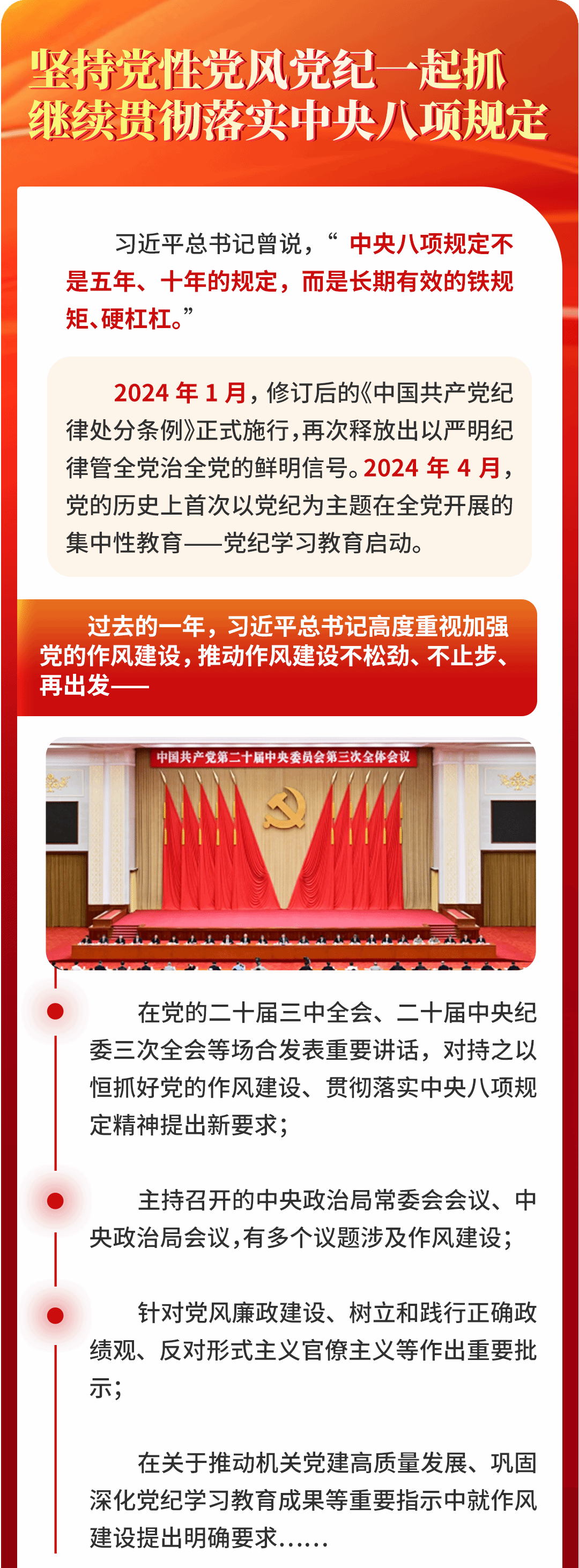 在二十届中央纪委四次全会上,习近平总书记强调:“把中央八项规定作为铁规矩、硬杠杠,严肃查处顶风违纪、隐形变异的‘四风’问题,督促党员、干部坚决反对特权思想和特权现象,树牢正确权力观、政绩观、事业观。”